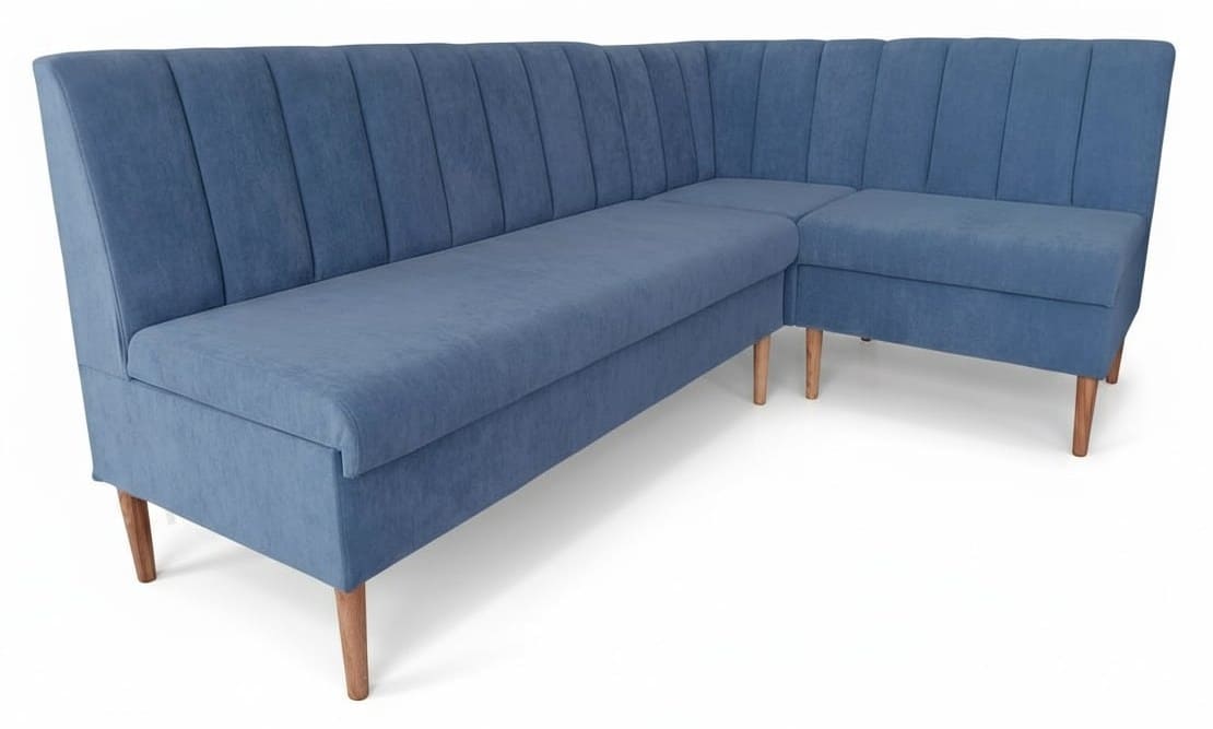 Диван (кресло) устанавливается на деревянные опоры при помощи шпильки. Могут быть изготовлены только в ткани. Данный кухонный угол не имеет спального места, но имеет короба для хранения.